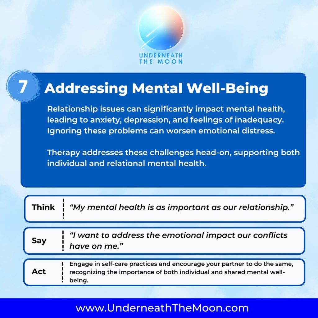 Relationship issues can significantly impact mental health, leading to anxiety, depression, and feelings of inadequacy. Ignoring these problems can worsen emotional distress.